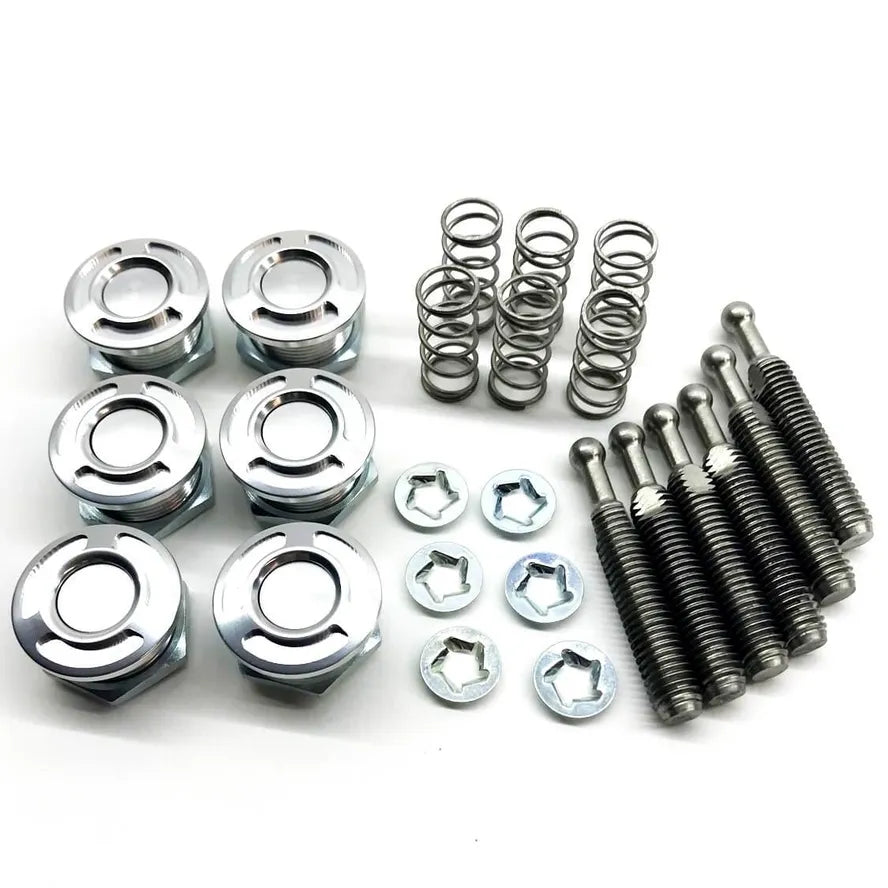 XXX Push Pull Fasteners are made from billet aluminum and stainless-steel for lightweight performance and durability. Available in black anodized or polished finishes, all necessary hardware included.
